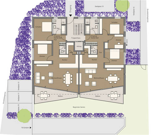 Diese beiden Wohnungen bieten komfortables Wohnen auf höchstem Niveau. Alle Flure und Räume sind so konzipiert, dass auch ein Rollstuhl bequem rangieren könnte. Besonders raffiniert ist die leichte Schrägstellung der Balkone und Glasfassaden.
