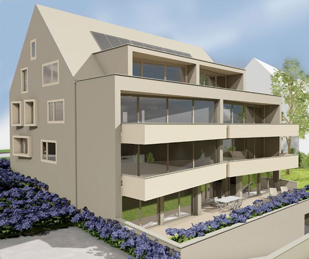 Sieben moderne großzügige Eigentumswohnungen zwischen 117 und 150 qm befinden sich in dem attraktiven Gebäude in Nonnenhorn am Bodensee. Besonders raffiniert ist die leichte Schrägstellung der Balkone und Glasfassaden auf der Südseite. Dadurch erhalten die Balkone automatisch unterschiedliche Blickrichtungen – für eine optimale Nutzung und ein Plus an Privatsphäre.
